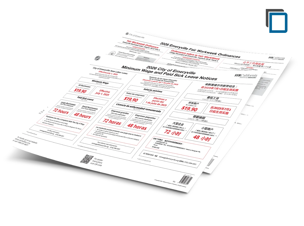 The Emeryville Labor Law Poster (24.5” x 16”) in English/Spanish/Chinese combined contains the official employment notices required by City of Emeryville’s Minimum Wage and Paid Sick Leave Ordinances. These notice obligations apply to all employers with employees, including part-time and temporary employees, who perform at least two hours of work in one calendar week in Emeryville. The poster must be posted in all languages spoken by 10 percent or more of your employees at a location.
