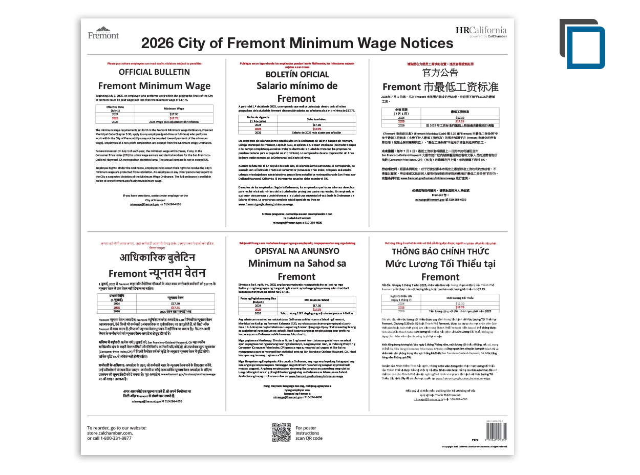 CalChamber’s 24” x 24" Fremont Minimum Wage Poster contains the official City of Fremont Minimum Wage Notice (English, Spanish, Chinese, Hindi, Tagalog and Vietnamese combined).