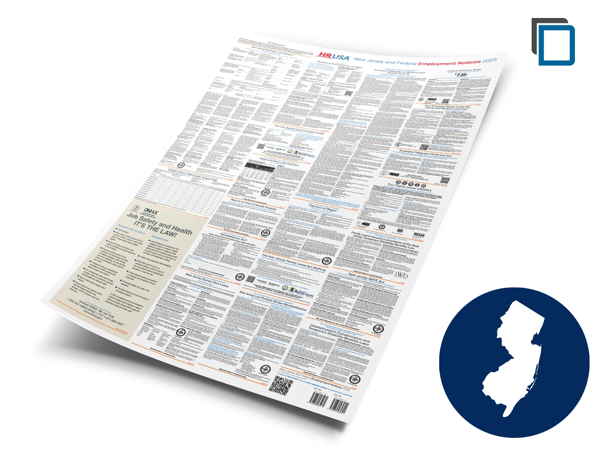 HRUSA's convenient 27.5" x 39.75" all-in-one poster contains easy to read state and federal employment notices every New Jersey employer must post—even if you only employ one person in New Jersey. Make sure you're in compliance.