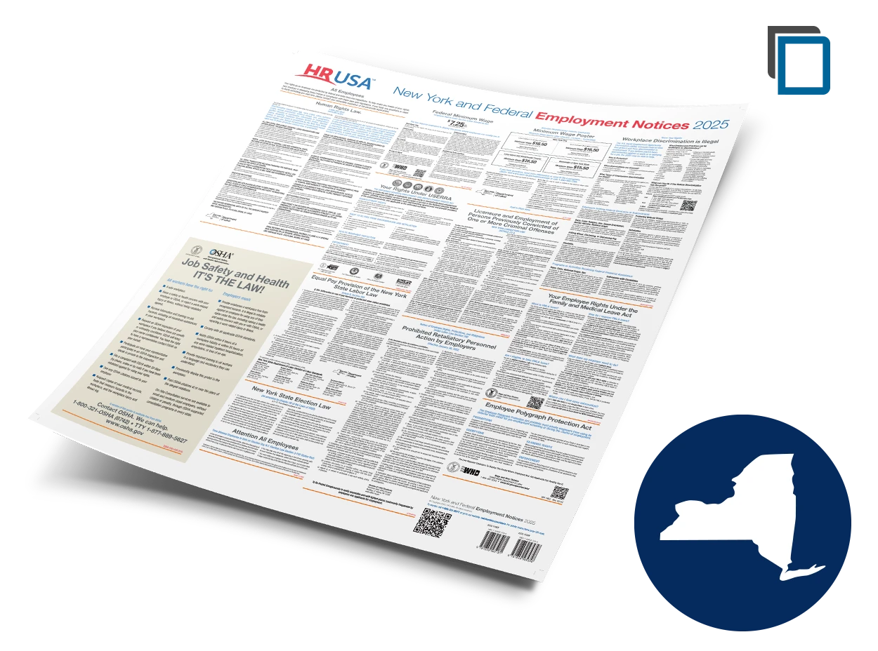 HRUSA's convenient 27.5" x 30" all-in-one poster contains easy to read state and federal employment notices every New York employer must post — even if you only employ one person in New York. Make sure you're in compliance.