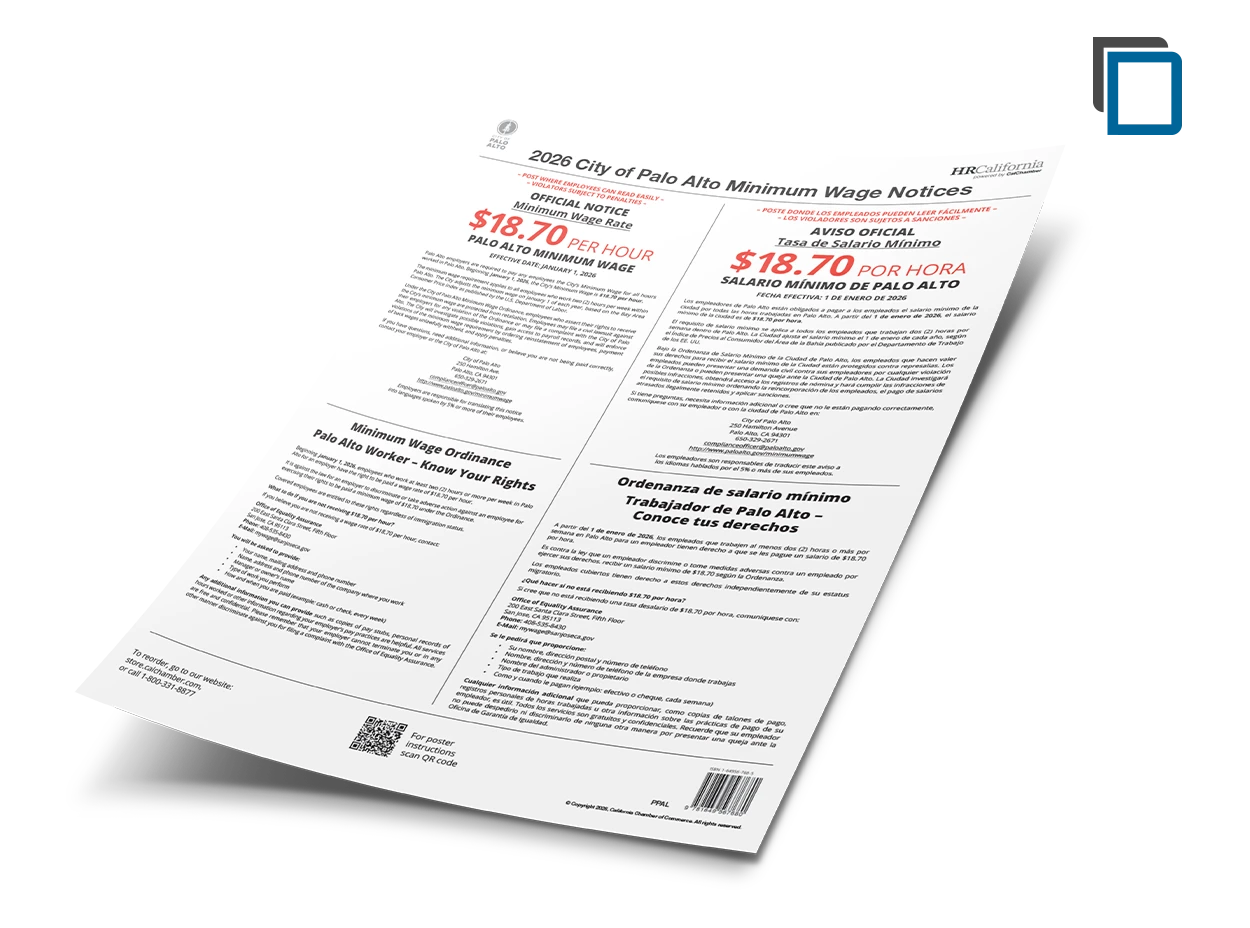 CalChamber’s 16” x 21” Palo Alto Minimum Wage poster (English and Spanish combined) contains these official notices with the current minimum wage as required by the City of Palo Alto’s Minimum Wage Ordinance: