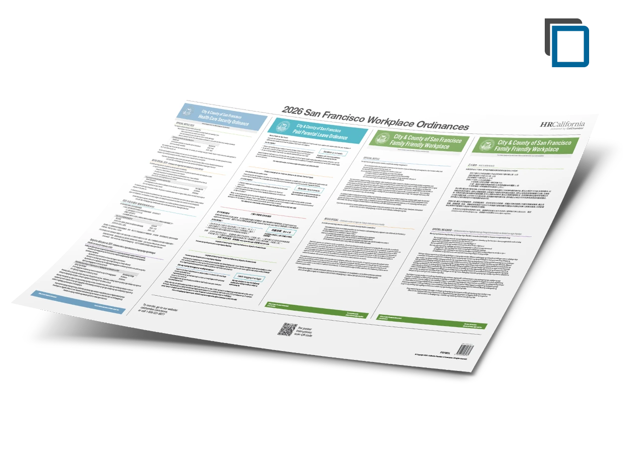Compliance Alert: CalChamber's Workplace Ordinance poster will reflect San Francisco's updated Health Care Ordinance notice with 2026 Employer Expenditure Rates effective 1/1/2026. Employers with 100+ workers @ $4.11 per hour; Businesses with 20-99 workers or Nonprofits with 50-99 workers @ $2.74 per hour. Businesses with 0-19 workers and Nonprofits with 0-49 workers are Exempt. Employers must post the most current notices.