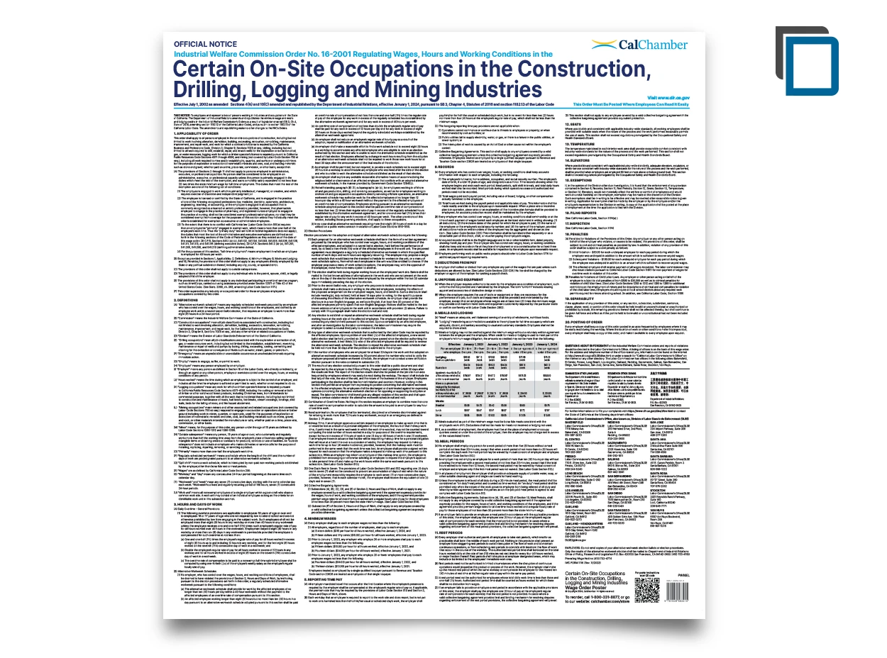 Wage Order 16 regulates wages, hours and working conditions in the On-site Construction, Drilling, Logging and Mining industries.
