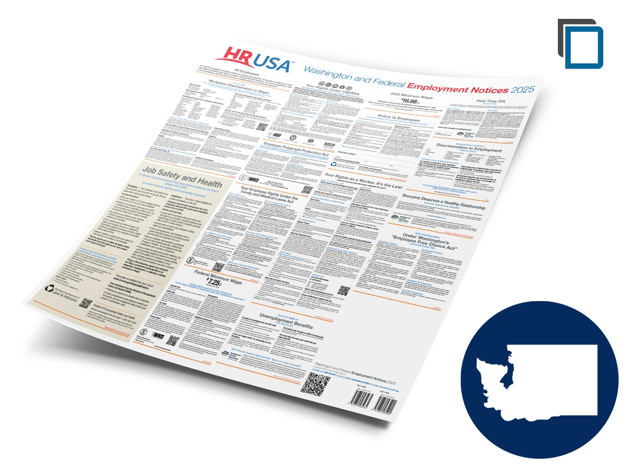 HRUSA's convenient 27.5" x 27.5" all-in-one poster contains easy to read state and federal employment notices every Washington employer must post — even if you only employ one person in Washington. Make sure you're in compliance.